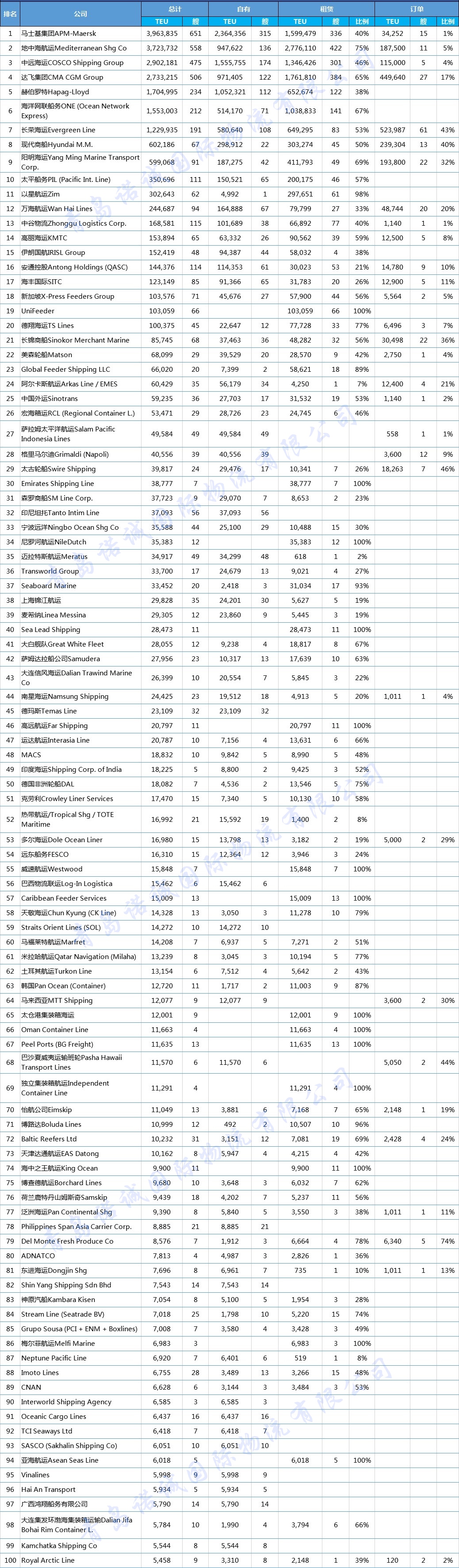 根據(jù)Alphaliner最新數(shù)據(jù)顯示,截至2020年07月03日,全球船公司運(yùn)力百強(qiáng)名單出來了,前十名依次是: